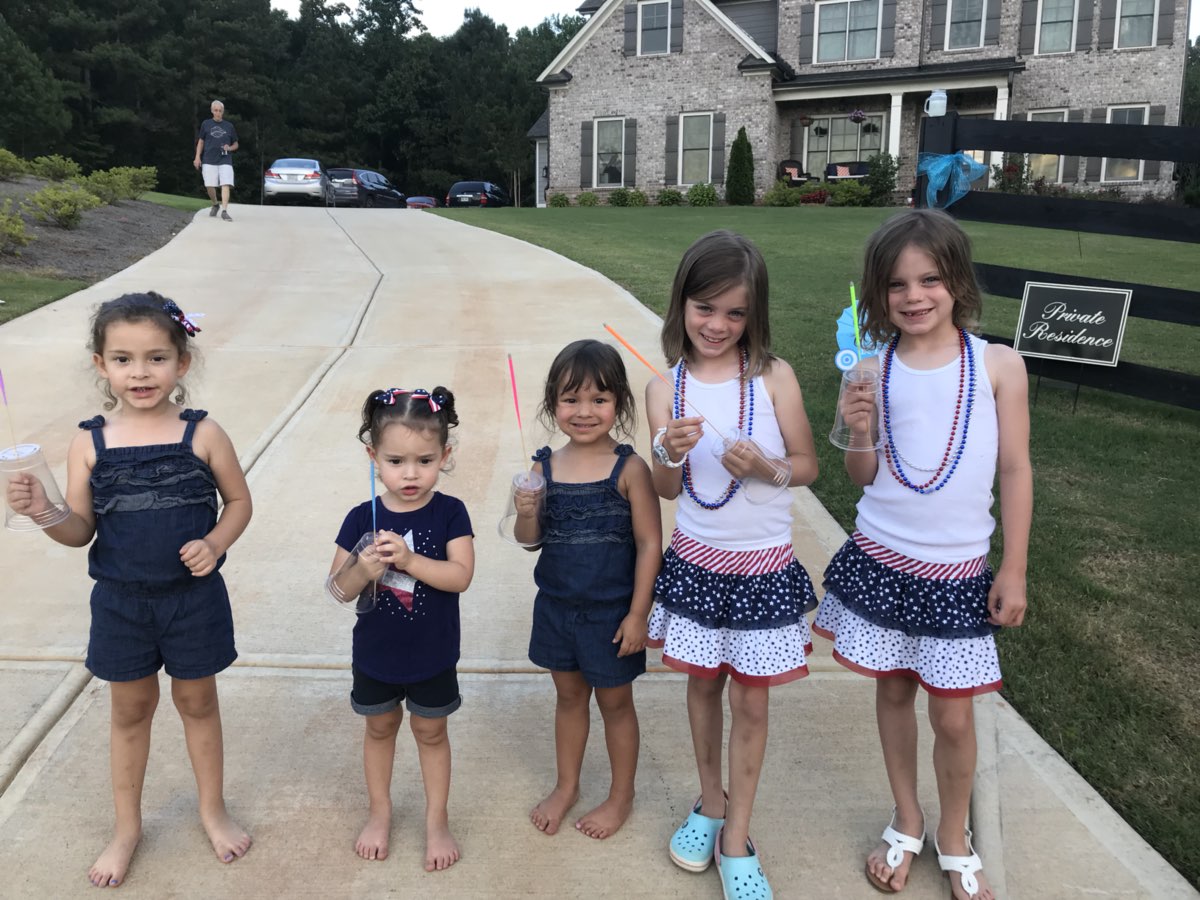 -We weren't outside a ton partly b/c walking was hard in the first couple of weeks for Mama, and it was just stinking hot!! BUT, one morning it was a bit cooler (or at least bearable) and we played outside while Daddy went out with Uncle Nick. You slept contently in the bouncy while Big Sisters rode bikes and scooters, and played bags : )