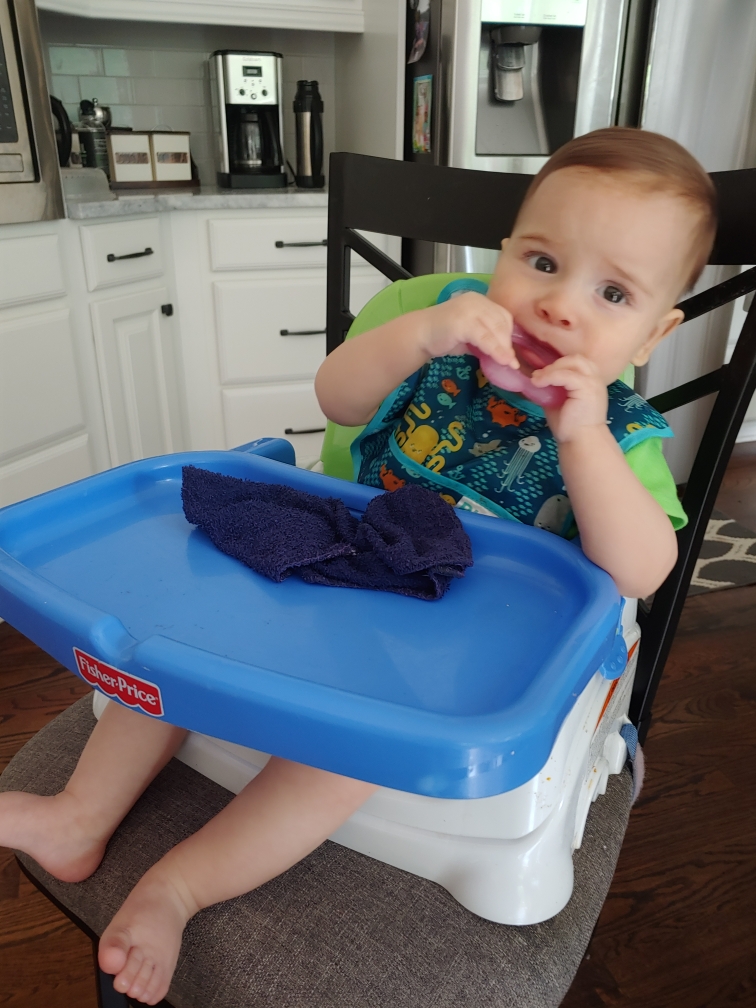 Eating: You breastfeed 4 times a day now, usually the early morning time, right before each nap, and then again before bed. You also eat 3 meals and a snack. Breakfast is usually oatmeal or smoothie. Lunch is usually a squeezie pouch with random crackers, veggie sticks, yogurt, teething crackers, fruit or whatever else I'm giving the girls that you will eat. Dinner I try to give you a modified version of whatever we're eating, but you still don't do well with meats/chicken even when chopped super small. You shove them all in your mouth, hoard them like a chipmunk and then cry b/c you can't swallow it all : ) Cheerios are usually involved at every meal as a way to keep you preoccupied/not hangry while Mama is getting food together! You LOVE cheerios and could eat them all day, every day!